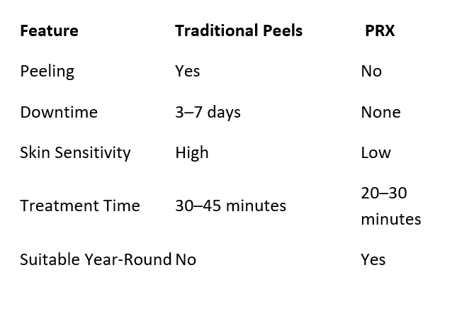 Traditional peels often involve several days of peeling, flaking, and sometimes redness or irritation. While effective, they may require significant downtime and post-treatment care. PRX offers many of the same benefits, such as increased collagen, better skin tone, and improved texture, without the visible side effects.