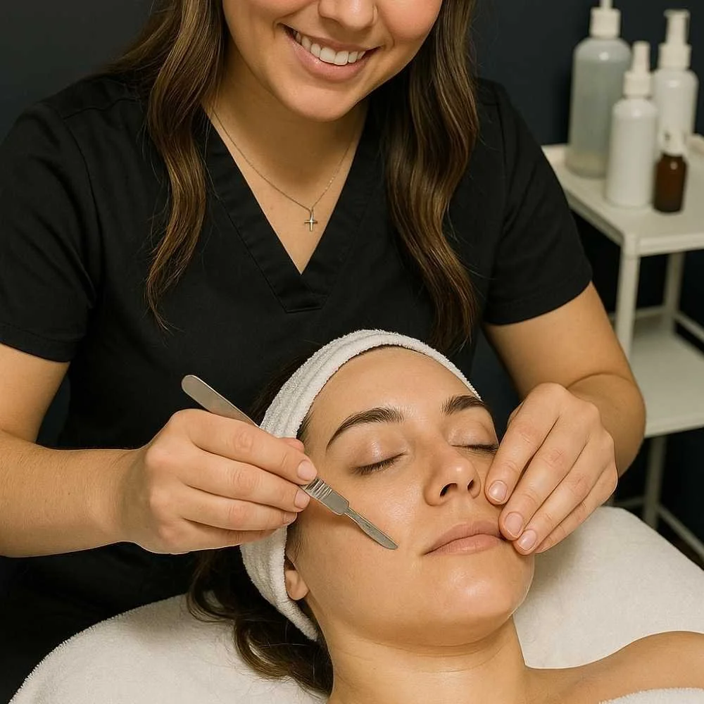 Dermaplaning is a gentle exfoliation technique using a surgical-grade scalpel to remove dead skin cells and fine hair (peach fuzz). It’s safe, painless, and leaves your skin ultra-smooth and radiant.